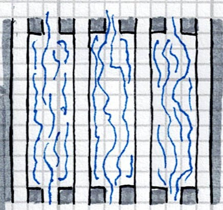 Nice and spacious, hallways enter at upper terraces on the north side, and stairs descend, following the downward flow of the water, to the south side. The water empties out into a deep shaft. There is no bridge, but a few rickety planks could easily be placed over the flow for an improvised crossing. Maybe keep some of those in a chamber nearby... Of course they can always just jump, but there's not a lot of space for getting a running headstart, and surfaces are bound to be little slippery.